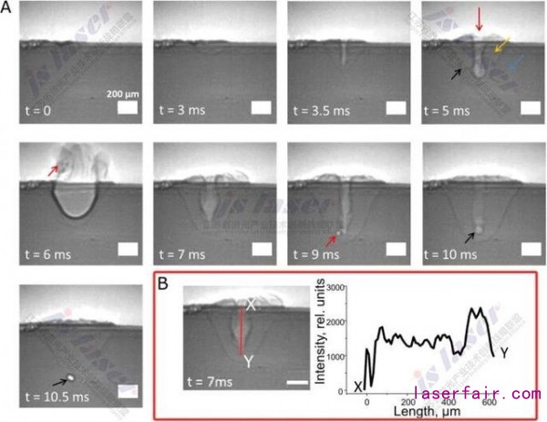 (A)鋁合金樣品在單脈衝(chong) 激光為(wei) 10ms,功率為(wei) 1kW的時候得到的典型的X射線圖像;(B)通道的匙孔像素強度分布,較亮的像素同低密度區域相對應