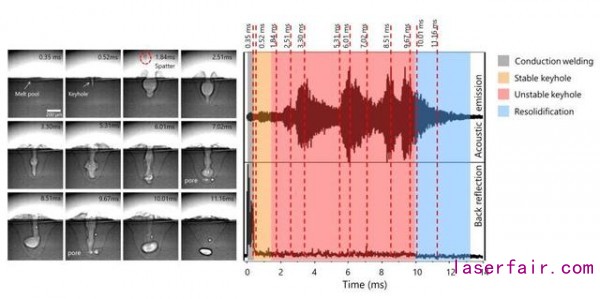 一旦激光轟擊金屬時,焊接的第一階段,熱傳(chuan) 導就會(hui) 發生,此時隻有表麵開始熔化。緊接著,一個(ge) 穩定的匙孔開始形成,此時搖擺(處於(yu) 穩定狀態的匙孔)開始長時間的暴漏在焊接過程中。有時匙孔會(hui) 吐出液態金屬,同火山噴發有點相類似(類似爆胎)。如果匙孔倒塌在一個(ge) 不可控的狀態下發生,就會(hui) 形成氣孔。所有這些階段就都可以在項目團隊的實驗中給予實時的監控和探測到。