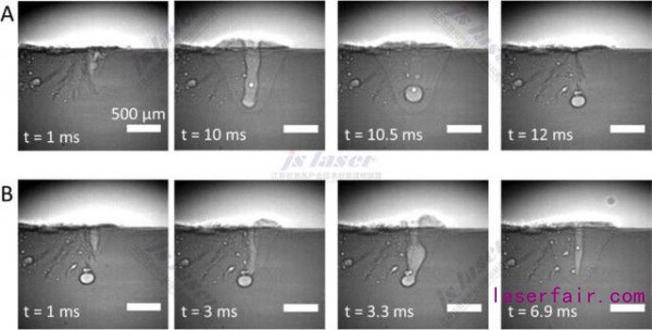 氣孔形成的X射線影像 (A)及其采用後續的激光脈衝(chong) 進行移除(B),顯示的是兩(liang) 個(ge) 連續的激光脈衝(chong) 的作用過程