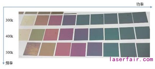 功率由小增大,在不鏽鋼上表現出來的顏色呈現出很規則的變化特征:黃色,紅色,藍色,綠色直至綠色慢慢變深。