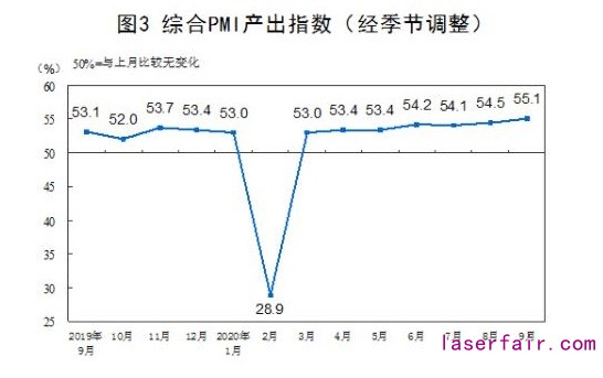 9月份,綜合PMI產(chan) 出指數為(wei) 55.1%,比上月上升0.6個(ge) 百分點,表明我國企業(ye) 生產(chan) 經營活動有所加快。