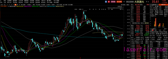 今日大盤表現較為(wei) 低迷,而白馬股大族激光卻逆勢上漲,漲幅一度超4%,截至收盤收漲2.56%,收盤價(jia) 35.6元/股。