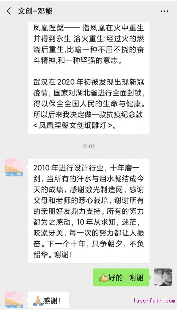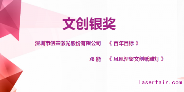 而深圳創鑫激光股份有限公司的作品《百年目標》、鄧能的個(ge) 人作品《鳳凰涅槃文創紙雕燈》榮獲本次激光文創大賽銀獎。