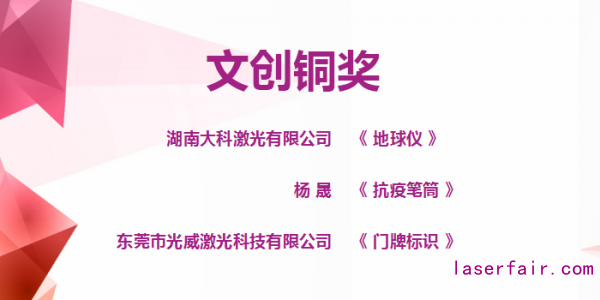 湖南大科激光有限公司的作品《地球儀(yi) 》、楊晟的個(ge) 人作品《抗疫筆筒》、東(dong) 莞市光威激光科技有限公司的作品《門牌標識》等三份作品榮獲本次激光文創大賽銅獎。