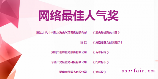 其中,浙江大學/中科院上海光學精密機械研究所邱建榮的作品《激光玻璃彩色內(nei) 雕》因其高超的技術含量、廣泛的用途、精美細致的工藝等優(you) 勢攏聚超高人氣,成為(wei) 最大贏家,榮獲本次激光文創大賽的金獎、網絡最佳人氣獎、現場最佳人氣獎三大獎項。