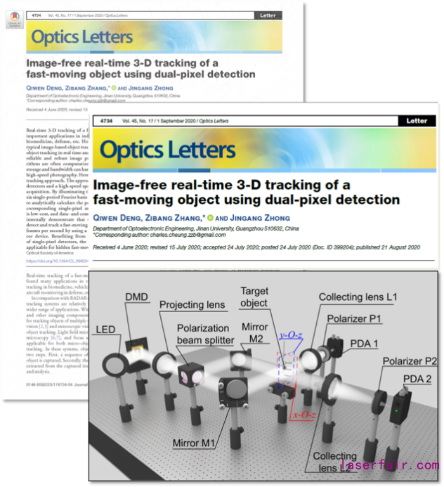 圖1. 鍾金鋼教授團隊在在美國光學學會(hui) 權威期刊Optics Letters上發表的題為(wei) “Image-free real-time 3-D tracking of a fast-moving object using dual-pixel detection”的研究論文