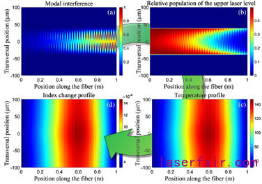 當光纖激光的輸出平均功率超過TMI閾值時,光纖中不同橫模之間便會(hui) 能量轉移,這種能量轉移需要相位匹配。長周期光柵(LPG)是一種允許光纖中不同橫模間進行能量交換的光學結構,其內(nei) 部折射率呈周期性(準周期性)分布,周期明顯長於(yu) 激光波長。為(wei) 了滿足不同橫模間的能量轉移條件,LPG中折射率變化的周期性和對稱性必須與(yu) 這些橫模所產(chan) 生的模間幹涉圖樣(MIP)相似。目前,廣泛接受的觀點認為(wei) 光纖中LPG的產(chan) 生是熱積累導致的。熱致LPG成因借助上圖1解釋為(wei) :當光耦合進大纖芯光纖後,能量大部分流入基模,少部分流入第一高階模。不同橫模在光纖中相速度的差異導致了MIP的產(chan) 生,使得纖芯中的光場呈現強弱交替的準周期性分布。相對於(yu) 弱的光場,強光場區域的反轉粒子數耗盡更快,所以這種光場的準周期性分布會(hui) 使得反轉粒子數也呈現出橫向不均勻的準周期性分布。反轉粒子數的變化會(hui) 影響功率放大和能量提取能力,隨之便會(hui) 產(chan) 生橫向不均勻的準周期性分布的溫度場。溫度分布的差異性會(hui) 在熱光效應的影響下生成準周期性分布的折射率光柵,這就是光纖中熱致折射率光柵(RIG)的產(chan) 生過程。