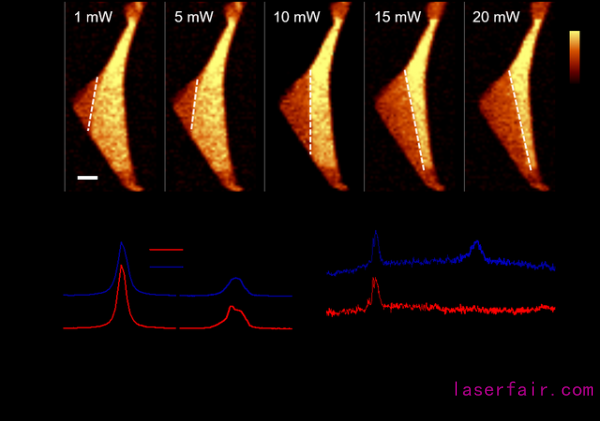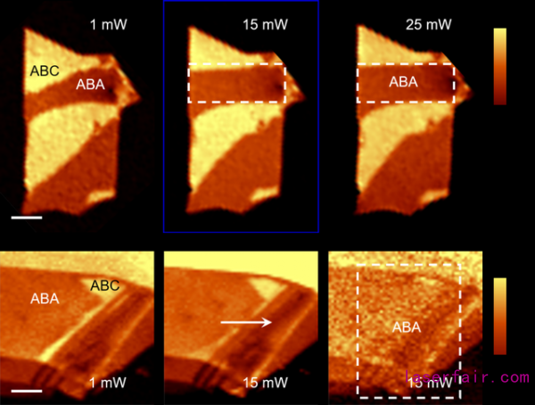 光學顯微鏡無法區分TLG中的ABA和ABC堆垛,本研究利用拉曼光譜2D特征峰的差異來判斷其堆垛結構,並通過共聚焦拉曼光譜顯微鏡對TLG進行了亞(ya) 微米尺度的掃描成像(圖2),其中ABA堆垛(暗)和ABC堆垛(明)之間的界麵即為(wei) 疇壁(domain wall)。除了拉曼光譜,光學二次諧波(SHG)也被用於(yu) 表征TLG的ABA和ABC堆垛,因為(wei) 前者是中心反演對稱破缺的,有SHG特征,而後者是中心反演對稱的,沒有SHG響應。論文中利用激光對TLG進行了麵掃描輻照,每次輻照完成後都進行一次拉曼成像。實驗結果表明,ABA-ABC疇壁在激光的驅動下產(chan) 生了明顯的移動。隨後,細致的拉曼光譜和SHG譜學測量也證明了TLG中從(cong) ABC堆垛到ABA堆垛的結構相變(圖3)。