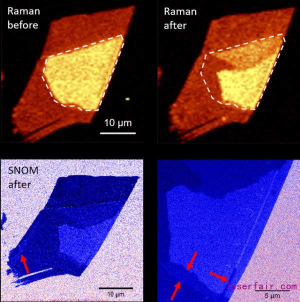 圖5 激光輻照前後六層石墨烯的拉曼成像與(yu) S-SNOM成像對比