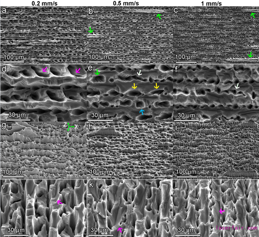 圖3 飛秒激光碎裂加工形成的微納結構俯視圖和不同角度側(ce) 視圖,不同掃描速度下(0.2,0.5和1mm/s,恒定激光能量(700mW)和恒定掃描間距(15微米)。(a-c)綠色箭頭指示部分碎裂溝槽。(j-l)粉色箭頭代表“鉤狀”結構的形成。