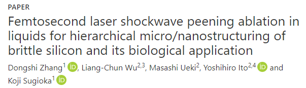 Zhang D S, Wu L C, Ueki M, Ito Y, Sugioka K. Femtosecond laser shockwave peening ablation in liquids for hierarchical micro/nanostructuring of brittle silicon and its biological application. Int. J. Extrem. Manuf. 2, 045001 (2020).
