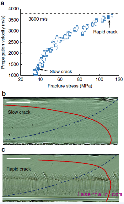 圖1(a)碎裂強度與(yu) 傳(chuan) 播速度的關(guan) 係。(b,c)低速和高速的矽材料碎裂紋痕。經許可轉載。版權所有(2018)Nature出版社。
