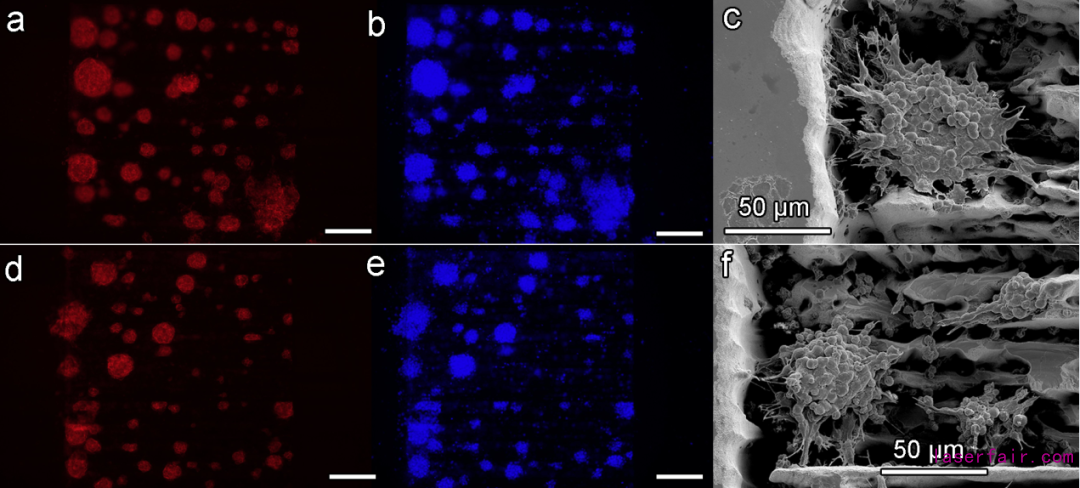 圖11 幹細胞形貌調控(a-c)和(d-f)在碎裂結構上(加工參數:功率700mW, 掃描速度0.2mm/s,掃描間隔5和15微米)經72小時培養(yang) 後的EB3幹細胞熒光染色光學圖片和SEM圖。