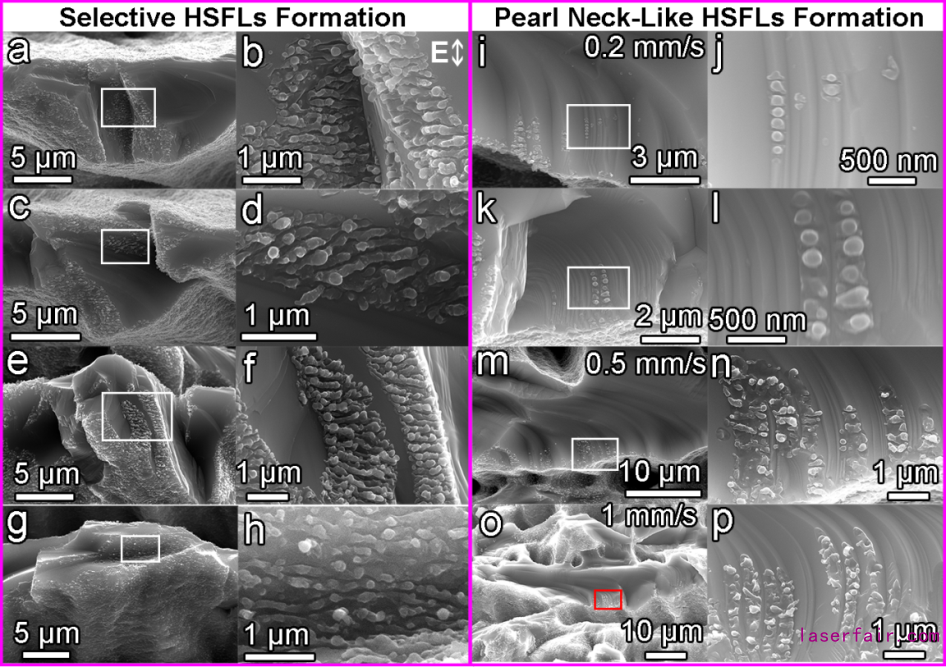 碎裂紋痕納米尺度重構正常情況下,碎裂紋痕的表麵應該是光滑的,但是實驗發現在碎裂結構的邊緣和相對密閉的空間生成了高頻周期結構HSFLs,如圖9a-h所示。這表明衝(chong) 擊波會(hui) 對碎裂的納米紋痕進行重構。通過Raman測試,發現HSFLs結構的形成與(yu) 矽無定形化有關(guan) 。由於(yu) 沒有明顯的熱融化痕跡,材料的無定型化應該是氣泡破裂產(chan) 生的相對比較溫和的衝(chong) 擊波導致的晶格缺陷和堆疊位錯所引起的。當納米紋痕間隔在100-200納米範圍之內(nei) ,納米紋痕被重構成珍珠項鏈狀納米顆粒陣列,如圖9i-p所示。此種結構在低掃描速度下相對比較均勻和完整,而在高掃描速度下則比較混亂(luan) ,表明改變掃描速度可以改變納米紋痕局部的應力場。