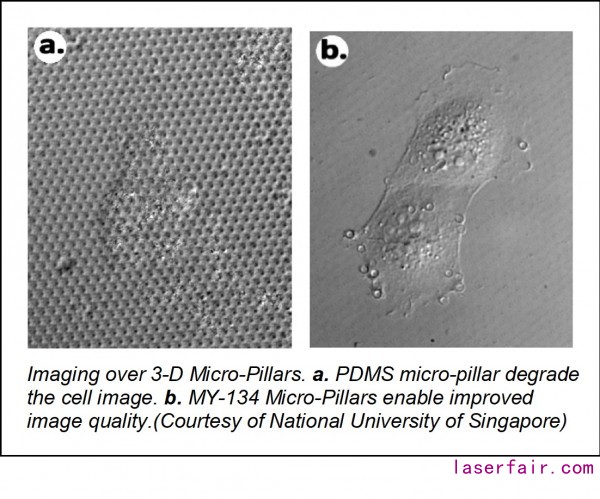 除在微流體(ti) 和微細胞陣列應用外,對於(yu) 那些在微物體(ti) 表麵有圖案的任何方式BIO-133也常常用來改善和提高在各種成像應用中的圖像分辨率,有趣的案例出現在用於(yu) 研究細胞過程的微柱製造狀構造物中。下麵圖片展示了在構建微柱狀時,使用BIO-133(右圖)比使用PDMS(左圖)所得到了圖像質量提升了許多。