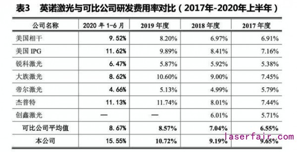 報告期內(nei) ,英諾激光研發費用的營收占比高於(yu) 行業(ye) 均值且逐年上升,數值分別為(wei) 9.65%,9.19%,10.72%和 15.55%,同行業(ye) 可比公司平均水平為(wei) 6.53%、7.04%、9.05%和8.67%,公司研發投入超過行業(ye) 平均水平(見表3)。