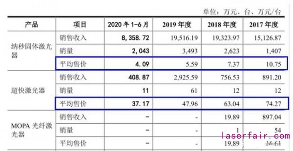 亦受此影響,報告期內(nei) 英諾激光主要產(chan) 品價(jia) 格持續下滑。數據顯示,2017年-2020年1-6月,公司納秒固體(ti) 激光器單價(jia) 分別為(wei) 10.75萬(wan) 元/台、7.37萬(wan) 元/台、5.59萬(wan) 元/台和4.09萬(wan) 元/台,報告期內(nei) 跌幅超過6成。同期,超快激光器產(chan) 品單價(jia) 也由74.27萬(wan) 元/台下滑至37.17萬(wan) 元/台,跌幅也達到50%。