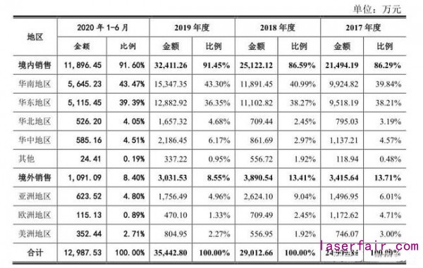 國內(nei) 市場日趨激烈,國外市場狀況也不容樂(le) 觀。受中美貿易摩擦等因素影響,英諾激光近幾年境外銷售受阻,境外收入及占比持續下降趨勢明顯。而在新冠疫情的衝(chong) 擊下,2020年上半年英諾激光境外收入僅(jin) 為(wei) 1091.09萬(wan) 元,占比僅(jin) 為(wei) 8.4%,較2017年下滑超過5個(ge) 百分點。