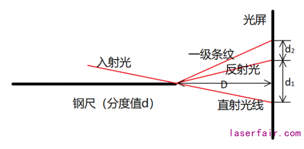 光柵是由大量等寬等間距的平行狹縫構成的光學器件,而鋼尺上的刻度正好構成了一個(ge) 光柵。當我們(men) 用激光照射鋼尺的邊緣時,一部分光直接照射至光屏上,另一部分照射至鋼尺表麵發生幹涉。