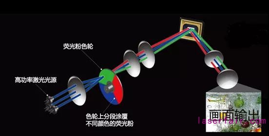 激光電視必須有一個(ge) 高速旋轉的熒光粉色輪,在色輪上分段塗上不同顏色的熒光粉,當色輪高速旋轉的同時,就可以實現不同基色光的發射。