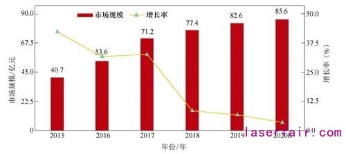 圖1 2010—2020E年fun88官网平台設備市場銷售收入和增長率[4]新的激光光源(如藍光半導體(ti) 激光器和高功率超快激光器)和新的激光加工技術(如金屬泡沫的激光成形和非常規激光微加工)的不斷湧現,給激光加工行業(ye) 帶來了極好的發展前景。以下對一些新型激光器和激光加工技術作簡單介紹。2019年光纖激光器市場是競爭(zheng) 激烈、也是繼續發展的一年。2019年中國光纖激光器市場銷售總額超過82.6億(yi) 元。從(cong) 我國光纖激光器市場來看,國產(chan) 光纖激光器逐步實現由依賴進口向自主研發、替代進口到出口的轉變。隨著國內(nei) 光纖激光器企業(ye) 綜合實力的增強,國產(chan) 光纖激光器功率和性能逐步提高,我國光纖激光器市場從(cong) 2015年的40.7億(yi) 元增長到2019年的82.6億(yi) 元,預計2020年會(hui) 小幅增長到85.6億(yi) 元(見圖2)。隨著光纖激光器市場規模的不斷擴大,光纖激光器核心器件的國產(chan) 化替代方案已基本成形,激光產(chan) 業(ye) 鏈日趨成熟,激光器的核心器件國產(chan) 化率也隨之提高,進而使得激光器的成本逐漸下降。激光器的價(jia) 格戰也出現了階段性的變化,價(jia) 格競爭(zheng) 主戰場從(cong) 1~3kW產(chan) 品段轉移至6~40kW產(chan) 品段。
