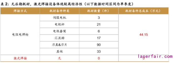 激光焊接經濟性已經凸顯。根據文獻《激光焊接在白車身上的應用現狀》(2016 年), 北京奔馳白車身生產(chan) 線中,傳(chuan) 統電阻電焊槍焊接方式設備初期采購成本較低,一條產(chan) 線以 205 台電焊槍計,每台成本我們(men) 假設為(wei) 2000 元,則一次采購成本約 41 萬(wan) 元。但傳(chuan) 統電阻焊耗材 金額較高,包括伺服電機、電極杆、電極套筒在內(nei) 的配套備件每季度消耗金額約 44 萬(wan) 元(文 獻數據);而激光焊接設備雖然一次采購成本較高,但後期幾乎無耗材支出。我們(men) 假設如今 一台激光焊接設備均價(jia) 為(wei) 100 萬(wan) 元,每條產(chan) 線配備 2 台激光焊接設備,則一次采購成本為(wei) 200 萬(wan) 元,相比傳(chuan) 統電阻焊高出 159 萬(wan) 元。但因耗材成本的節約,激光焊接設備在 4 個(ge) 季度 內(nei) 即可抹去一次采購成本差(159<44×4)。