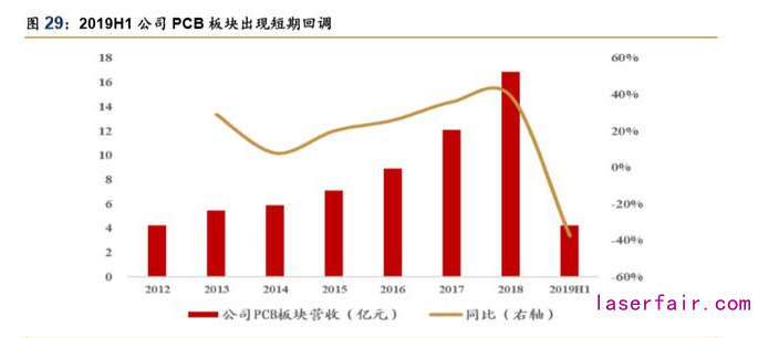 2019 年板塊營收回調,2020 年有望重回高景氣。受中美貿易摩擦等因素影響,2019 年全球 PCB 產(chan) 業(ye) 出現短期波動。根據 Prismark 於(yu) 2019 年 Q4 的預測,2019 年全球 PCB 產(chan) 值同比-1.7%,這是自 2015 年來全球 PCB 產(chan) 值首次出現同比下滑;國內(nei) 方麵,2019 年國 內(nei) PCB 產(chan) 值預計同比+0.7%,增速明顯放緩。公司方麵,受下遊需求趨穩影響,PCB 板塊 收入出現暫時回調,2019H1 板塊營收 4.2 億(yi) 元,同比-37.6%。我們(men) 認為(wei) 隨著國內(nei) 5G 建設 的持續落地,下遊客戶延遲的采購訂單預計於(yu) 今年迎來集中釋放期,帶動公司 PCB 板塊迎 來景氣度拐點,重返上升通道。