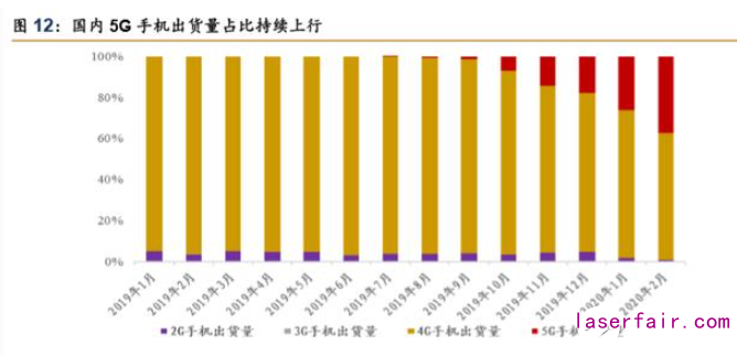 5G 手機出貨量占比持續快速提升。根據中國信通院最新數據,2020 年 1-2 月,國內(nei) 手 機市場總體(ti) 出貨量 2719.7 萬(wan) 部,同比-44.0%;從(cong) 出貨結構來看,其中 2G 手機 38.9 萬(wan) 部、 4G 手機 1896.4 萬(wan) 部,5G 手機 784.5 萬(wan) 部。雖然受終端消費需求疲軟影響,總體(ti) 手機銷量 大幅下降,但 5G 手機銷量占比持續快速提升。2020 年 1 月 5G 手機銷量占比為(wei) 26.3%,2 月該比例提升至 37.3%。