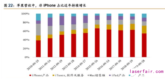 看好未來非 iphoness 訂單占比提升,應用場景進一步打開。以 ipads、Apple Watch、 AirPods 為(wei) 代表的手機以外的消費電子產(chan) 品近年來銷量持續釋放,配套產(chan) 線中對激光加工設 備的需求拓寬了激光設備應用場景。例如 Apple Watch 生產(chan) 工藝中,就采用激光工藝進行去 毛刺處理,此外部分版本產(chan) 品表冠的鋸齒狀紋路也采用激光進行衝(chong) 刻;AirPods 無線充電盒 提供激光鐫刻服務。公司目前來自蘋果的收入可大致拆分為(wei) iphoness+非 iphoness,其中 iphoness 相關(guan) 收入仍占主要。隨著蘋果非 iphoness 產(chan) 品在營收占比的逐步擴大(2019 財年,蘋果非 iphoness 營收占比達 66%,同比+8pp),我們(men) 認為(wei) 蘋果未來將持續發力非 iphoness 產(chan) 品線,加 大相關(guan) 產(chan) 品的研發力度與(yu) 資源傾(qing) 斜,公司產(chan) 品有望受益於(yu) 此打開下遊市場豐(feng) 富度,進一步增 厚板塊業(ye) 績。