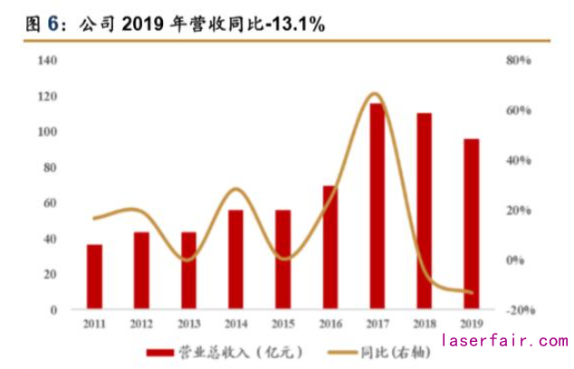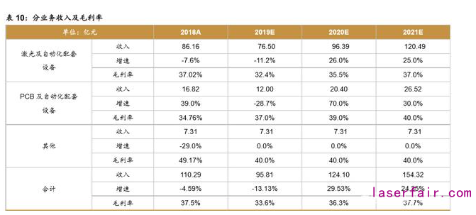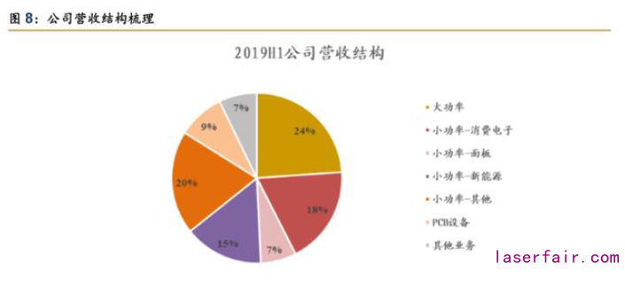 由於(yu) 公司 2019 年業(ye) 績快報中未披露各業(ye) 務板塊具體(ti) 收入,我們(men) 以 2019 半年報數據為(wei) 例對公司營收結構進行拆分。2019H1 公司實現營收 47.3 億(yi) 元(同比-7.3%),其中激光設備 板塊營收 39.7 億(yi) 元(同比-2.7%),PCB 設備板塊營收 4.2 億(yi) 元(同比-37.6%),其他業(ye) 務 營收 3.4 億(yi) 元(同比-2.3%)。激光設備板塊中,大功率板塊營收 11.3 億(yi) 元(同比-5.4%); 小功率營收 28.4 億(yi) 元,其中小功率板塊可繼續細分為(wei) :1)消費電子營收 8.8 億(yi) 元(同比 -17.7%);2)麵板營收 3.2 億(yi) 元(同比+7.5%);3)新能源營收 7.1 億(yi) 元(同比+125.2%); 4)小功率其他業(ye) 務營收 9.3 億(yi) 元。