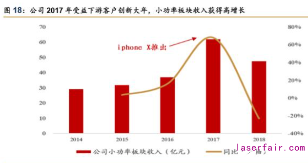 2017 年受益 A 客戶創新大年,公司小功率板塊取得大幅增長。公司自 2008 年獲得蘋 果認證切入其產(chan) 業(ye) 鏈,2012 年成功打入蘋果核心供應商名單;2017 年受益客戶新品重大創 新帶動的產(chan) 線設備需求斬獲大量訂單,業(ye) 績取得高速增長;而 2018-2019 年蘋果創新力度趨 緩,導致對產(chan) 線設備更換需求回落,公司小功率板塊所有承壓。