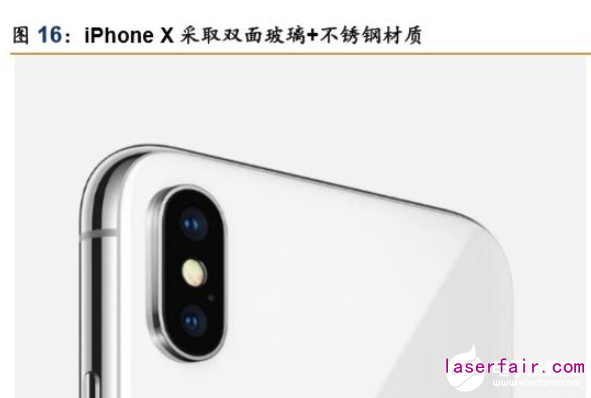 2017 年,蘋果推出新款機型 iphoness X,作為(wei) iphoness 係列十周年產(chan) 品,新款機型采取了 諸多重大創新,例如屏幕首次采用 OLED 材質、取消沿用 10 年的底部 Home 鍵、後置雙攝 改為(wei) 了豎向排列以及重啟雙麵玻璃+不鏽鋼材質中框設計等。機身的重大革新催生了生產(chan) 線 采用新的設備及工藝需求,其中對於(yu) 新增激光加工設備需求包括: