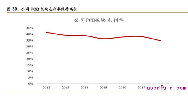 板塊毛利率承壓,但仍維持高位,預計 2020 年受益產(chan) 品結構改善毛利率回升。公司 PCB 板塊主營產(chan) 品包括機械鑽孔機、激光鑽孔機、LDI(激光直接曝光機)等。受益激光鑽孔機、 LDI 等設備高毛利,板塊整體(ti) 毛利率維持高位。2018 年板塊毛利率為(wei) 34.8%,同比-3.2pp。 我們(men) 預計,隨著 5G 時代對 PCB 加工精密度要求的提升將增厚激光鑽孔設備、LDI 等高端設 備需求,公司 PCB 板塊產(chan) 品結構的改善預計將推動板塊毛利率的穩步回升。
