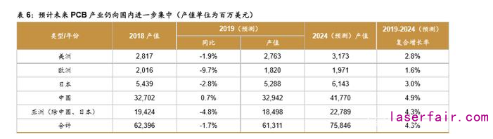 受益本土人力成本優(you) 勢以及龐大的消費電子市場驅動電子產(chan) 業(ye) 鏈的日臻完備,大陸近年 持續承接歐美及台灣的 PCB 產(chan) 能。根據機構 Prismark 的統計結果,2018 年全球 PCB 產(chan) 值 約為(wei) 624 億(yi) 美元,同比增長約 8%;其中 2018 年中國大陸 PCB 產(chan) 值約為(wei) 327 億(yi) 美元,同比 增長約 10%,大陸 PCB 產(chan) 值占全球 PCB 產(chan) 值的比重已達 51%,相比 2008 年這一比例已提 升 20pp。如今國內(nei) 已經形成了以珠三角、長三角地區為(wei) 核心區域的 PCB 產(chan) 業(ye) 聚集帶,中西 部地區近年由於(yu) 成本優(you) 勢,PCB 產(chan) 能擴張持續提速,未來有望成為(wei) 下一重要產(chan) 業(ye) 集群。根據 Prismark於(yu) 2019年Q4的預測,2019-2024年中國地區PCB產(chan) 值複合增長速度將達到4.9%, 高於(yu) 全球 PCB 產(chan) 值複合增長率 4.3%,PCB 產(chan) 業(ye) 仍將繼續向中國大陸集中。