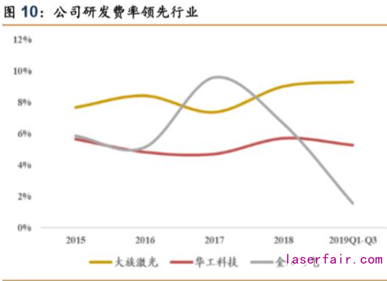 研發投入持續高位,領先國內(nei) 同行業(ye) 企業(ye) 。根據公司 2019 年三季報,公司 2019 前三 季度研發費率為(wei) 9.3%,同比+2.0pp,研發投入持續增長;橫向對比來看,國內(nei) 激光設備行 業(ye) 的華工科技同期研發費率為(wei) 5.3%、金運激光為(wei) 1.6%。