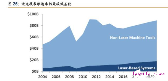 激光技術滲透率仍處低基數,行業(ye) 天花板遠未達到。根據 IPG 公布的測算結果,目前全 球材料加工設備市場規模約 920 億(yi) 美元,其中激光設備市場約 140 億(yi) 美元,占比為(wei) 15%。 低滲透率基數為(wei) 激光設備行業(ye) 仍然保留了極大發展空間,行業(ye) 天花板遠未達到。