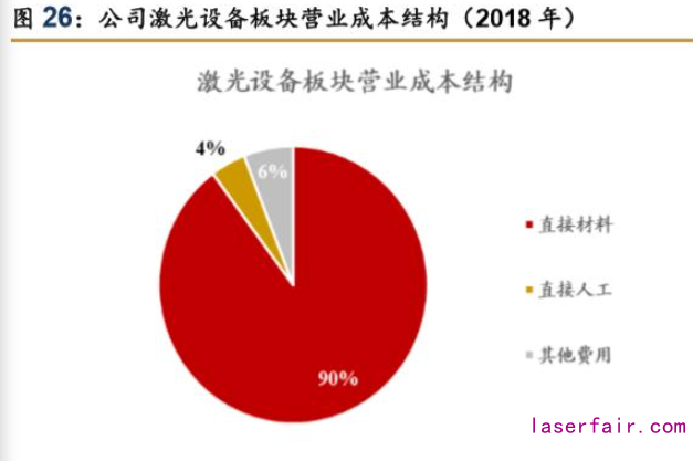 激光器為(wei) 公司采購成本最高的上遊元件。通過拆解公司激光設備板塊曆年成本結構,可 以看出直接材料成本占板塊營業(ye) 成本約 90%。進一步拆分來看,激光器光源為(wei) 最大細分項。 根據公司 2018 年發布的可轉債(zhai) 募集說明書(shu) 中數據,公司外購的原材料主要包括激光器、電 機平台、振鏡等。以 2017H1 為(wei) 例,激光器、電機平台、振鏡分別占公司原材料采購總額的 35.8%、4.8%、2.5%;從(cong) 供應商來看,公司激光器主要采購自美國 IPG。