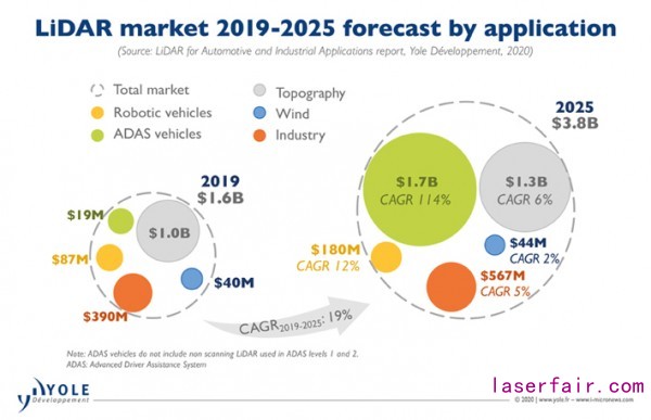 Yole技術和市場分析師Alexis Debray表示:“高級駕駛輔助係統(ADAS) 的LiDAR市場將實現114%的年增長率,從(cong) 2019年的1900萬(wan) 美元增長到2025年的17億(yi) 美元。”(如圖1) 期望如此之高,但激光雷達市場麵臨(lin) 阻礙,急需大膽創新。