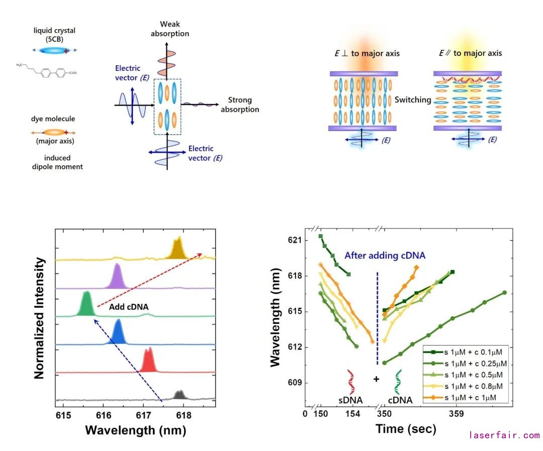 在此微腔中,增益介質是由摻雜染料與(yu) 液晶形成的主-客體(ti) 複合材料。液晶的永久性偶極矩產(chan) 生作用於(yu) 染料的誘導偶極矩。因此染料的排列也會(hui) 隨著液晶而改變。如圖三所示. 當入射光的電矢量(E)垂直於(yu) 染料分子的主軸時,會(hui) 發生弱吸收。當入射光的電矢量(E)平行於(yu) 染料分子的主軸時,會(hui) 發生強吸收。在注入了sDNA的F-P腔中加入cDNA之前和之後的激光切換。堿基開始配對後,激光開始返回原始波長附近。