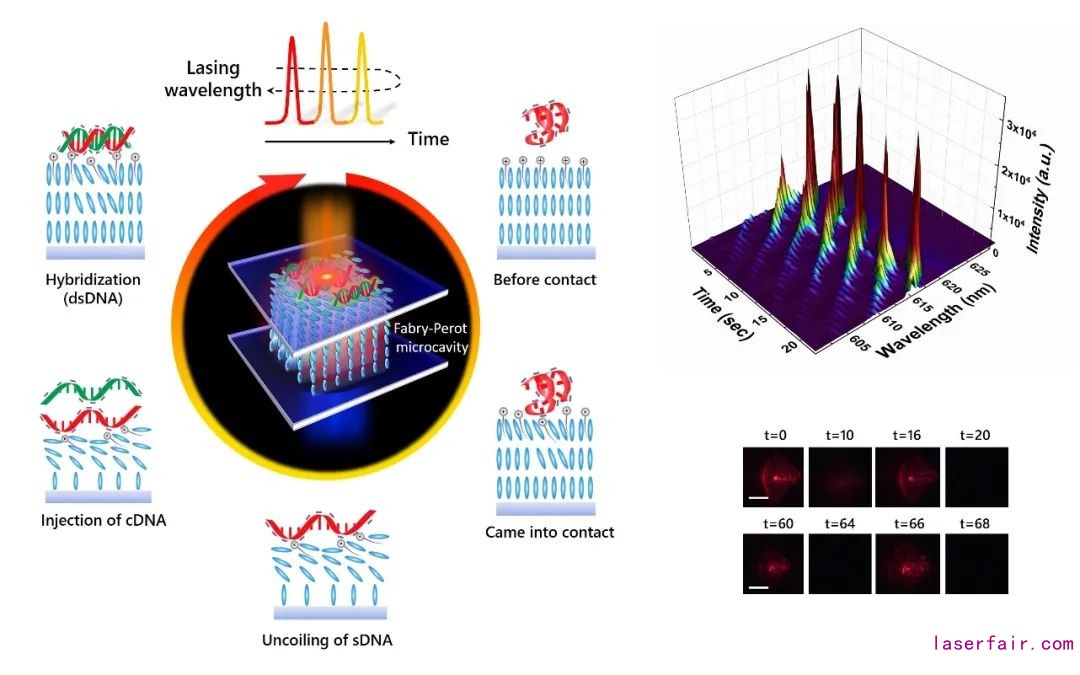 法布裏-珀羅微腔包含兩(liang) 個(ge) 反射鏡和在兩(liang) 鏡之間的光學增益介質。課題組采用摻了染料的液晶為(wei) 增益介質,目的是為(wei) 了增強對堿基配對的響應,並利用DNA-液晶特殊的互動,作為(wei) 轉換原理來改變微腔中液晶的排列方向從(cong) 而實現激光中不同波長之間的切換。