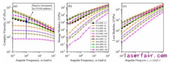 圖1.純乙烯-乙烯醇(EVOH),不同LDPE熔體(ti) 流速下的純低密度聚乙烯(LDPE)和LDPE/EVOH混合物的(a)複數粘度,(b)儲(chu) 存,(c)損耗模量隨角頻率的變化