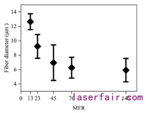 圖3.熔體(ti) 流速(MFR)對純低密度聚乙烯纖維直徑的影響