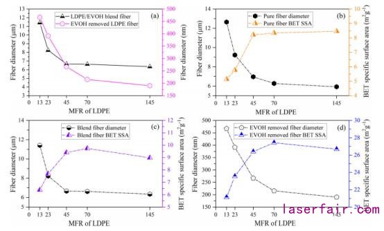 隨著MFR的增加,觀察到純LDPE和去除EVOH的LDPE纖維直徑呈線性減小。但是,由於(yu) 組分的熔體(ti) 粘度提高,較高MFR下的LDPE/EVOH共混纖維的直徑略有增加。從(cong) 共混纖維中去除EVOH後,纖維直徑大幅度減小,從(cong) 而使超細纖維恢複到穩定的納米尺寸。