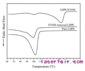 圖7.純低密度聚乙烯(LDPE),去除乙烯-乙烯醇(EVOH)的LDPE和LDPE/EVOH纖維的差示熱掃描