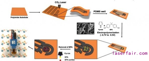 提出的采用激光刻畫石墨烯 改性聚合物的分子印記用於(yu) 丙二酚的示意圖