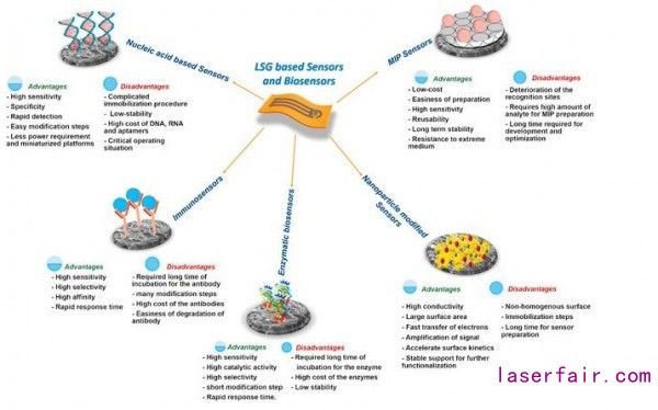 激光衍生石墨烯(LDG) 電化學傳(chuan) 感器和生物傳(chuan) 感器的優(you) 點和缺點的圖形化表示