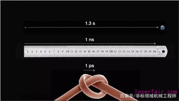 “超快激光”,是指輸出激光的脈衝(chong) 寬度在10-12s即皮秒級別,或小於(yu) 皮秒級別的脈衝(chong) 激光。想象一下,光在如此短的時間,能跑多遠?假設地球上有個(ge) 人將激光筆對著月亮,大概1.3秒後,激光就會(hui) 達到月球表麵。當然得理想化一點,光沒有散射或損耗。而對於(yu) 1皮秒的時間,光也就隻能走頭發絲(si) 打個(ge) 結的距離了。