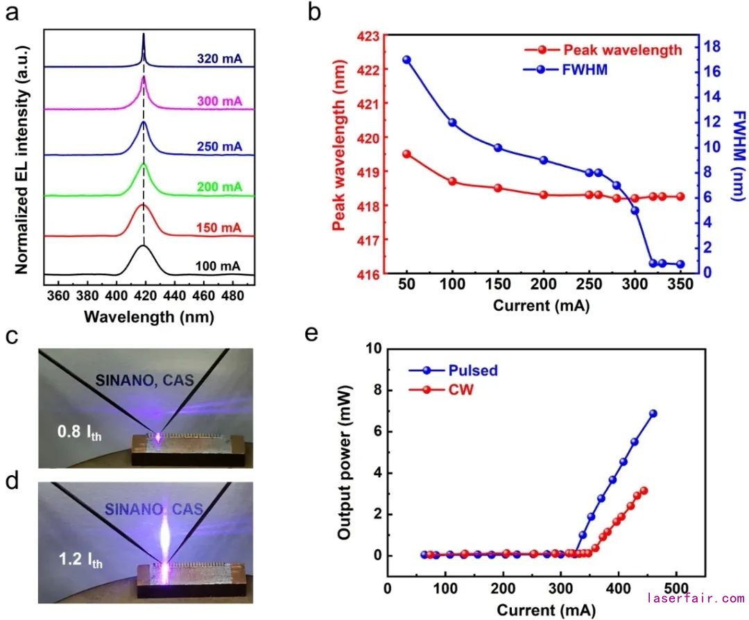 圖4. 矽基GaN翻轉脊形波導激光器(脊形尺寸:10×800 μm2)的(a)不同注入電流下的電致發光光譜,(b)電致發光光譜峰值波長與(yu) 半高寬隨注入電流的變化曲線,(c) 0.8倍和(d) 1.2倍閾值電流下的遠場光斑,(e)輸出功率-電流曲線。