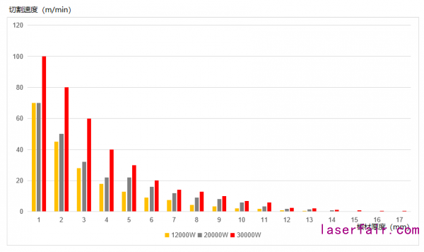 以空氣切割碳鋼為(wei) 例,30000W相比20000W效率提升20%-80%,相比12000W效率提升20%-200%;氧氣切割碳鋼最大厚度為(wei) 70mm。