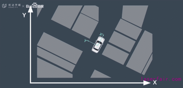 我們(men) 在車輛自身的坐標係中測量這些距離,以及靜態障礙物的方向。在車輛自身的坐標係中,汽車的前進方向始終向前,當汽車左轉或右轉時,坐標係與(yu) 汽車一同旋轉,以使車輛的前進方向在坐標係中繼續向前。隨著車輛的轉彎,車輛自身的坐標係必然與(yu) 地圖坐標不一致(見圖3),車輛的坐標和地圖的坐標可能都取決(jue) 於(yu) 手機導航係統中的設置。